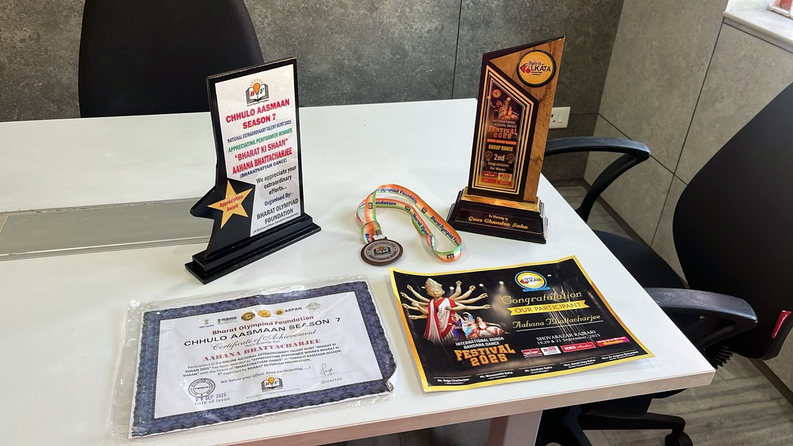 Aahana Bhattacharjee of Class VIII-A has achieved remarkable success in the field of dance. She was awarded by the Bharat Olympiad Foundation in Chhulo Aasmaan Season 7 – Online National Extraordinary Talent Hunt: Bharat Ki Shaan 2025, where she received a Certificate of Achievement, a memento, and a medal for her outstanding performance in Bharatanatyam dance, and was honoured as the Appreciating Performer Winner – Bharat Ki Shaan. She also participated in the International Durga Bandana Dance Festival 2025, organised by Spirit Kolkata at Shovabazaar, Rajbari, on 19th, 20th, and 21st September 2025, where she secured the Second Position in the dance competition. For this achievement, she was awarded a certificate and a memento in rocognition of her graceful performance.